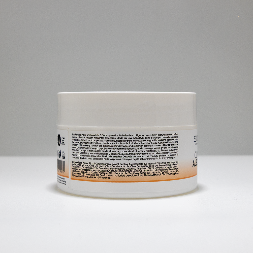 Blend de 5 óleos (coco, macadâmia, argan, alecrim e manteiga de karité): nutre profundamente, repara danos e repõe nutrientes essenciais, devolvendo maciez e força aos fios.